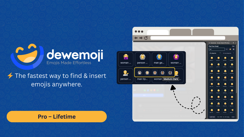 Dewemoji is here to make emojis fun, fast, and effortless — and with Pro, you get the full power to make every message, tweet, or project pop.